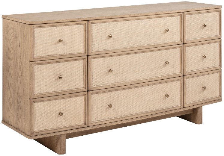 This nine-drawer dresser offers generous storage and timeless style, making it an essential piece for your bedroom. The beige oak finish exudes warmth and sophistication, while the smooth metal extension glides ensure easy access to your wardrobe. Antique brass hardware adds a vintage-inspired touch, blending beautifully with the overall design.Read More