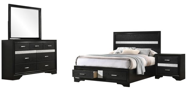 Create a stunning bedroom ensemble that's fit for modern royalty. Each gorgeous piece in this four-piece set flaunts silvery, sparkling accents for a truly glamorous look. The bed features a solid, straight silhouette and two storage drawers built into the base.Read More