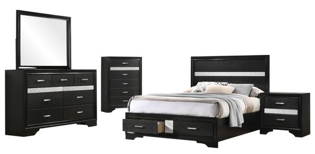Stylish and ultra-chic, this glamorous, five-piece bedroom set is the ultimate in modern luxury. Giving you everything you need to complete your bedroom ensemble. The mattress-ready platform bed offers the added bonus of footboard storage. Glittery stripes and rhinestone detailing add a brilliant touch of bling to this exquisite bedroom set.Read More