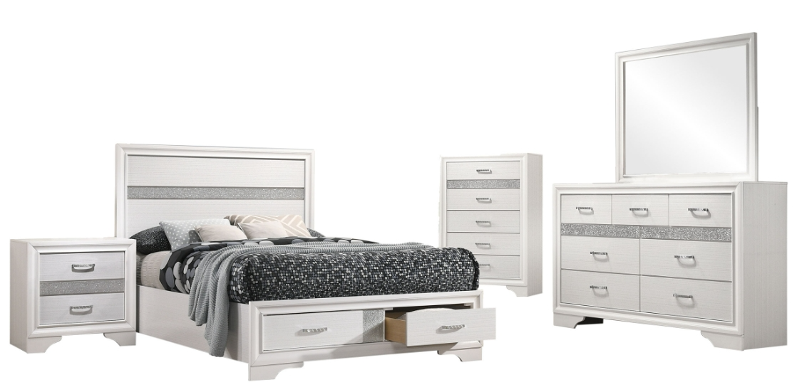 Stylish and ultra-chic, this glamorous, five-piece bedroom set is the ultimate in modern luxury. Giving you everything you need to complete your bedroom ensemble. The mattress-ready platform bed offers the added bonus of footboard storage. Glittery stripes and rhinestone detailing add a brilliant touch of bling to this exquisite bedroom set.Read More